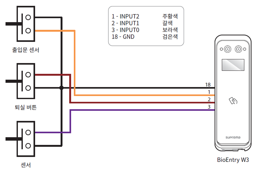 별도의 I/O 장치를 연결하지 않고 제품을 직접 출입문 잠금 장치, 퇴실 버튼, 출입문 센서 등에 연결할 수 있습니다.