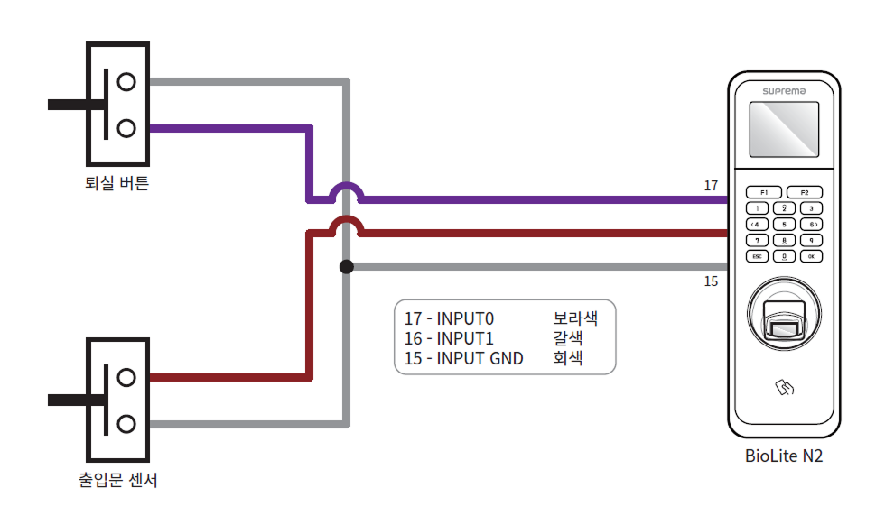별도의 I/O 장치를 연결하지 않고 제품을 직접 출입문 잠금 장치, 퇴실 버튼, 출입문 센서 등에 연결할 수 있습니다.