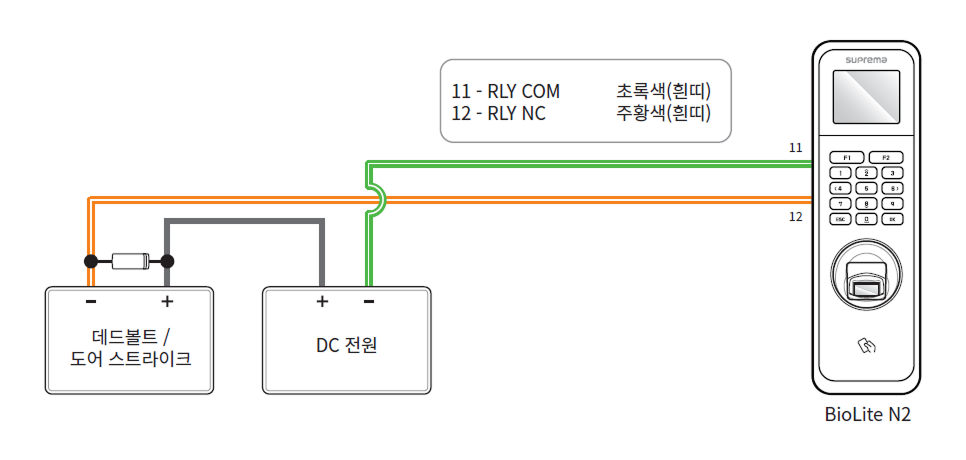 슈프리마의 지능형 장치에는 편의를 제공하기 위해 별도의 컨트롤러 없이 독립형으로 연결하여 출입문을 직접 열거나 잠글 수 있도록 하는 릴레이가 내장되어 있습니다. 그러나 향상된 보안이 요구되는 출입통제 애플리케이션의 경우 잠재적으로 출입문 잠금 해제를 유발할 수 있는 변조 공격을 방지하기 위해 장치에 내장된 릴레이를 사용하지 않는 것이 좋습니다. 이러한 애플리케이션의 경우 잠금 제어를 위해 출입문 내부의 안전한 위치에 설치된 슈프리마의 Secure I/O 2, DM-20, CoreStation과 같은 별도의 릴레이 장치를 사용할 것을 권장합니다.