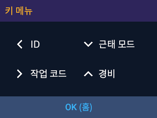OK 버튼을 누르면 키 메뉴 화면이 나타납니다. 키 메뉴 또는 홈 화면에서 원하는 메뉴에 해당하는 방향 버튼을 눌러 진입할 수 있습니다.