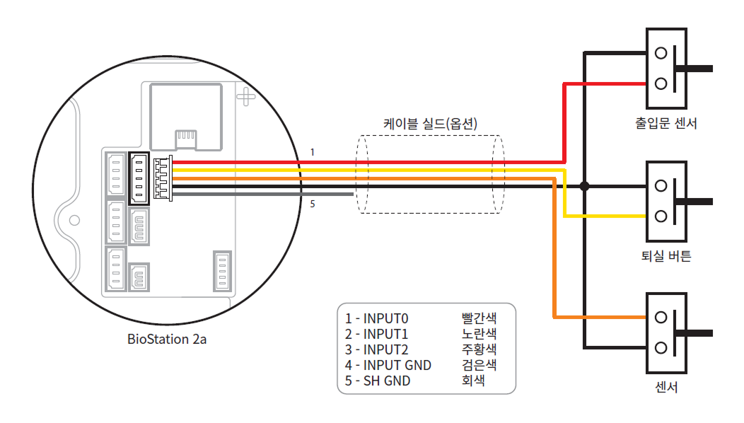별도의 I/O 장치를 연결하지 않고 제품을 직접 출입문 잠금 장치, 퇴실 버튼, 출입문 센서 등에 연결할 수 있습니다.