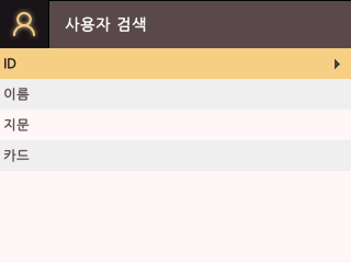 사용할 검색 수단을 선택한 뒤 버튼을 누르세요. ID, 이름, 지문, 카드로 사용자를 검색할 수 있습니다.