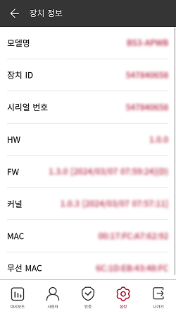 설정 → 장치 → 장치 정보를 선택하세요. 모델명, 장치 ID, 시리얼 번호, HW, FW, 커널, MAC, 무선 MAC 정보를 확인할 수 있습니다.