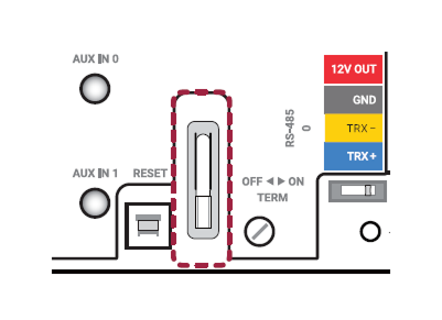 RS-485 데이지 체인 연결의 양 끝에 종단 저항(120 Ω)을 연결하세요. 중간 선로에 연결할 경우 신호 레벨이 작아져 통신 성능이 떨어지므로 반드시 데이지 체인 연결의 양 끝에 연결하세요. 이 제품의 종단 저항 스위치를 ON으로 설정하세요.