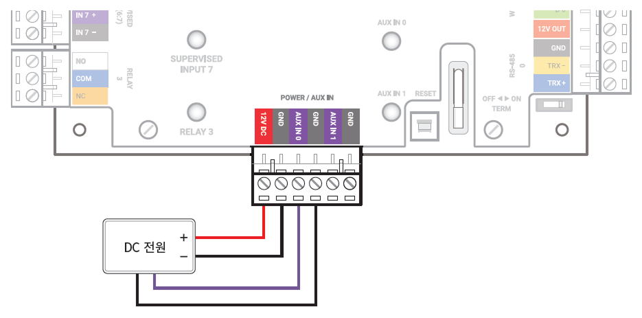 전원 장애 감지기나 탬퍼를 AUX IN 단자에 연결할 수 있습니다.