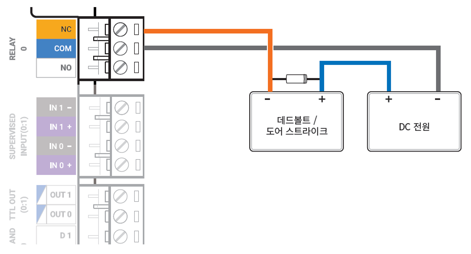 Fail Secure Lock을 사용하려면 아래 그림과 같이 NO 릴레이를 연결하세요. Fail Secure Lock은 평상 시 릴레이 회로에 전류가 흐르지 않으며, 릴레이가 동작하여 전류가 흐르면 출입문이 열립니다. 정전이 되거나 외부 요인으로 장치의 전원이 끊길 경우 출입문이 잠깁니다.