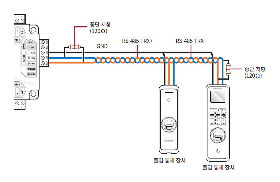 RS-485 데이지 체인으로 연결할 경우 종단 저항(120Ω)을 데이지 체인 연결의 양 끝에 연결하세요. 중간 선로에 연결할 경우 신호 레벨이 작아져 통신 성능이 떨어지므로 반드시 데이지 체인 연결의 양 끝에 연결하세요.