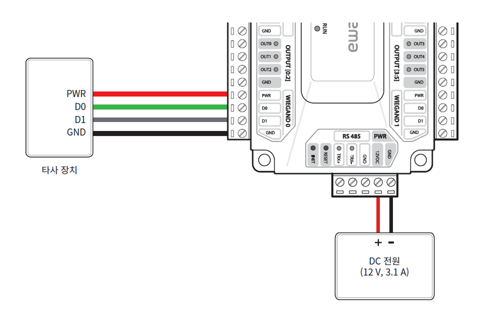 Wiegand 장치를 연결하여 사용할 경우 제품과 12 V, 3.1 A 전원을 연결하세요.