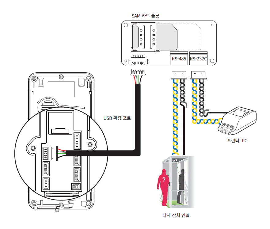 슈프리마 장치에 확장 모듈을 장착하면 추가적으로 RS-485, RS-232C 포트 및 SAM 카드를 사용할 수 있습니다.