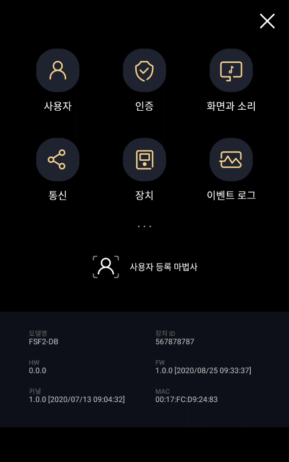 FaceStation F2사용하기관리자 메뉴PDFFeedback목차 보기관리자 메뉴관리자 권한으로 접근 가능한 주요 메뉴와 기능을 안내합니다. 전체 메뉴 을 누른 뒤 관리자 권한 인증 수단으로 인증하세요. 원하는 메뉴를 선택하세요. 알아두기관리자가 지정되어 있지 않을 경우 을 누르면 메뉴 화면이 나타납니다.