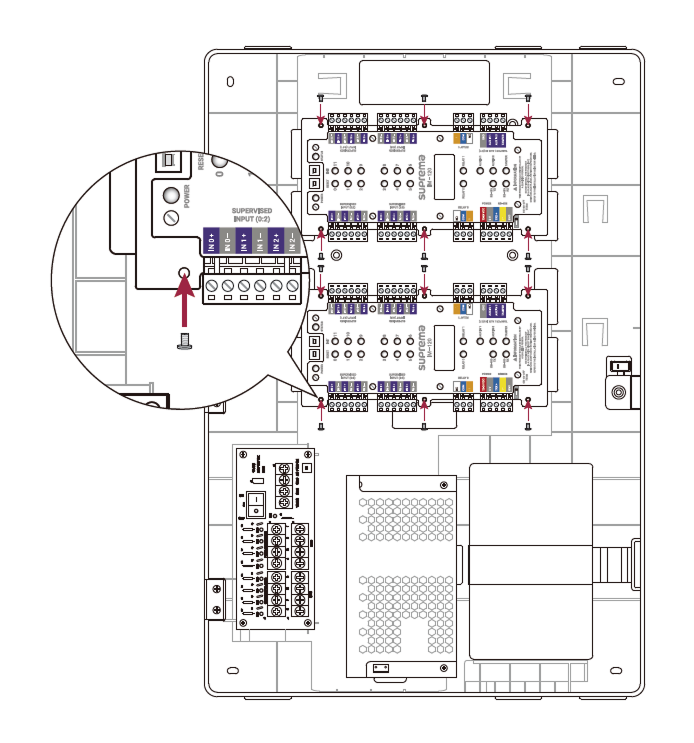 화재 감지 센서, 열 감지 센서, 방범 센서, 출입문 센서, 퇴실 버튼 등을 연결할 수 있습니다. SUPERVISED INPUT 0~11 단자는 회로에 흐르는 전압을 감지하여 장치의 단선, 단락, 켜짐, 꺼짐 상태를 모니터링할 수 있으며, 일반적인 Input으로 사용할 수도 있습니다.