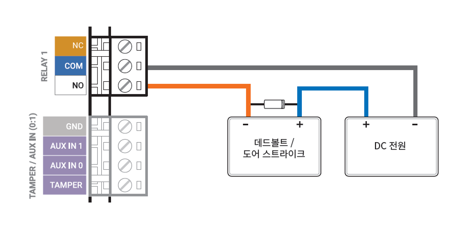 이 제품의 릴레이로 출입문 잠금 장치 또는 경보 장치를 제어할 수 있습니다. 연결할 장치의 가이드를 참고하여 릴레이를 NC 또는 NO로 연결하세요.
