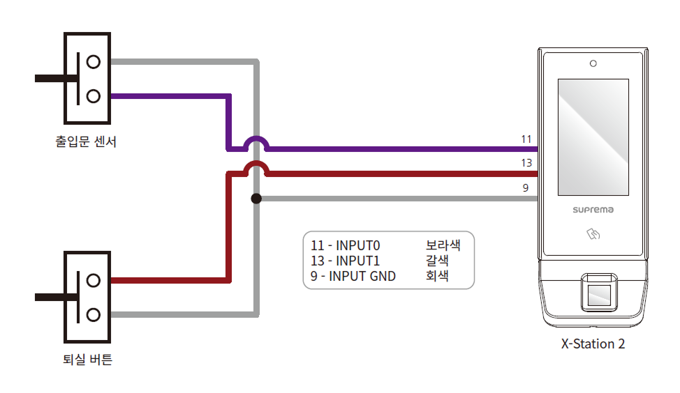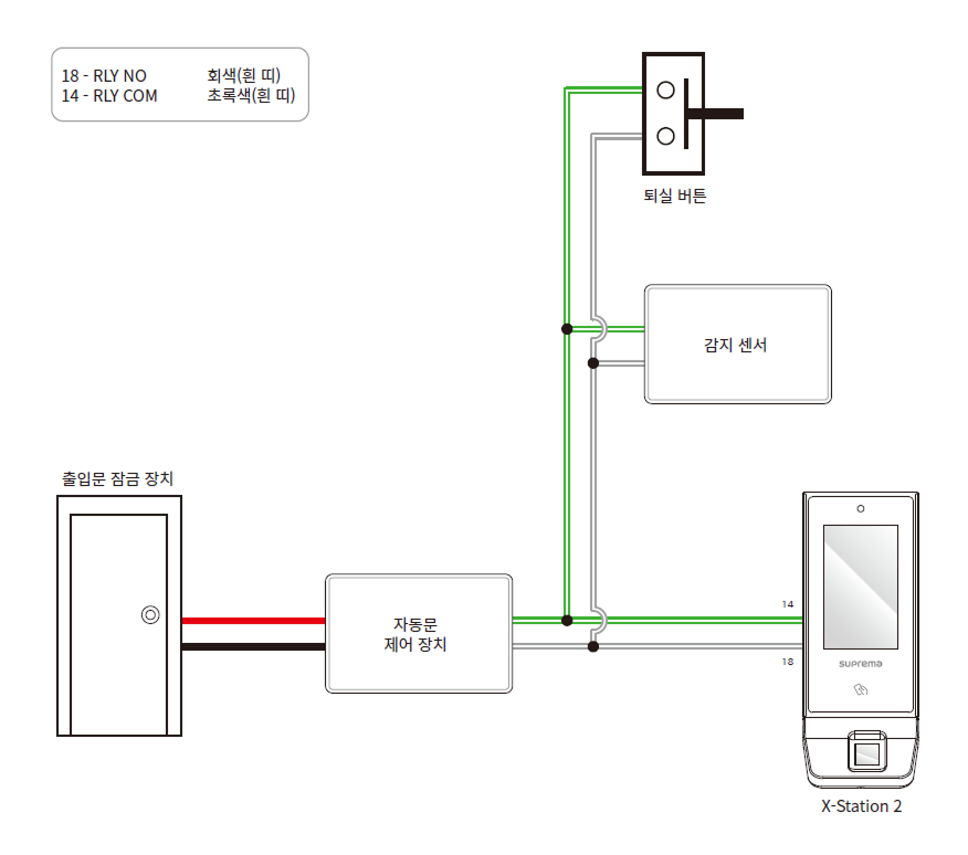 별도의 I/O 장치를 연결하지 않고 제품을 직접 출입문 잠금 장치, 퇴실 버튼, 출입문 센서 등에 연결할 수 있습니다.