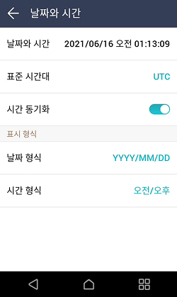 날짜와 시간: 현재 날짜와 시간을 확인할 수 있습니다. 직접 수정하려면 시간 동기화를 끄세요.