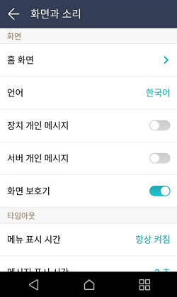 메시지 표시 시간: 설정 완료 메시지나 알림 메시지 등이 자동으로 사라지는 시간(초)을 설정할 수 있습니다.
