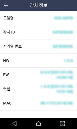 모델명, 장치 ID, 시리얼 번호, 장치 및 펌웨어의 버전, 커널, MAC 주소를 확인할 수 있습니다.