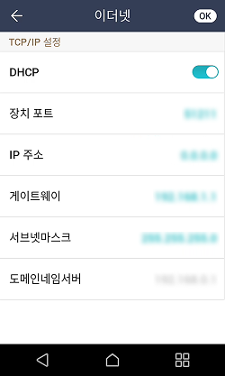 DHCP: DHCP 사용 여부를 설정하세요. DHCP 설정을 끄면 장치 포트, IP 주소, 게이트웨이, 서브넷마스크, 도메인네임서버를 사용자가 수정할 수 있습니다.