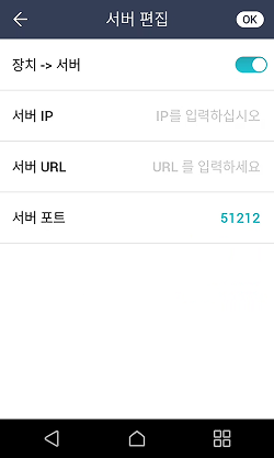 장치 → 서버: 장치에서 입력한 정보를 가진 서버로 직접 연결 신호를 보낼 수 있습니다. 장치 → 서버 설정을 켜면 서버 IP, 서버 URL, 서버 포트를 사용자가 입력할 수 있습니다.