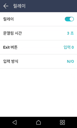 릴레이: 릴레이 활성화 여부를 설정할 수 있습니다. 릴레이 설정을 켜면 문열림 시간, Exit 버튼을 설정할 수 있습니다.