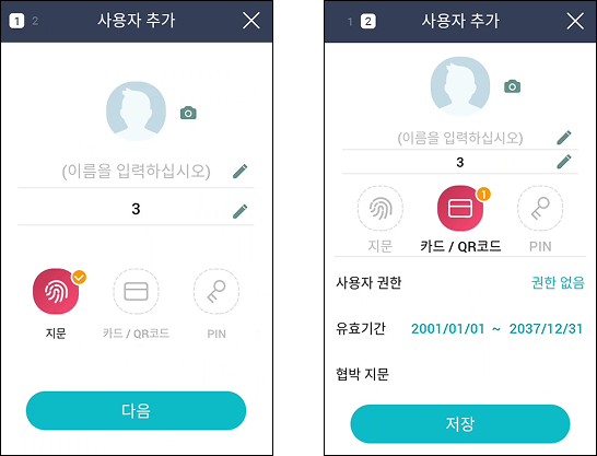 카드 / QR코드: 사용자 인증을 위한 카드를 등록할 수 있습니다. 카드 / QR코드 → 다음을 누른 뒤 사용자에게 할당할 카드를 RF 카드 인증부에 스캔하세요. 카드를 더 등록하려면