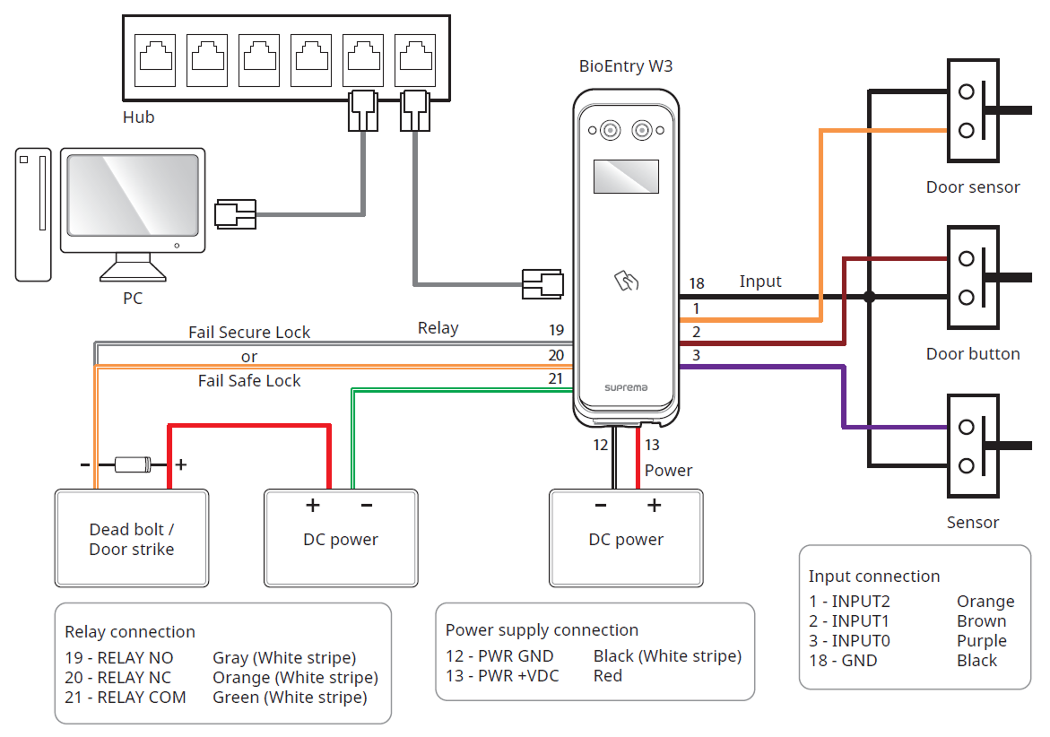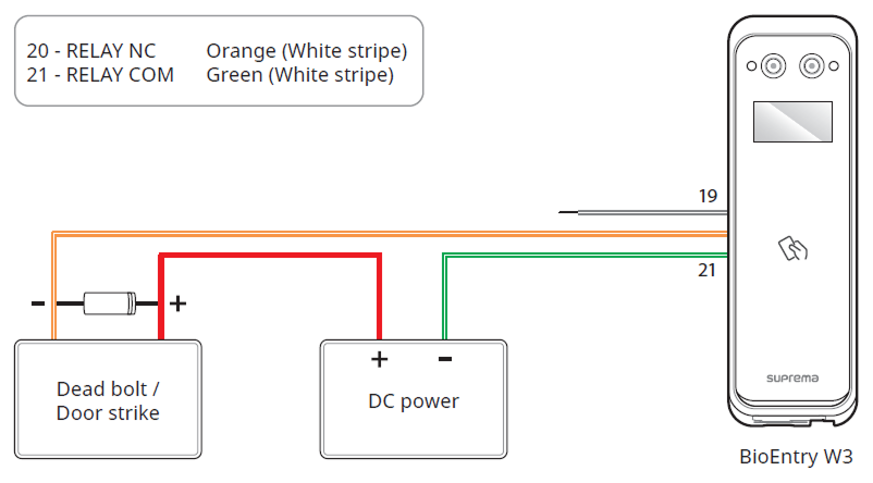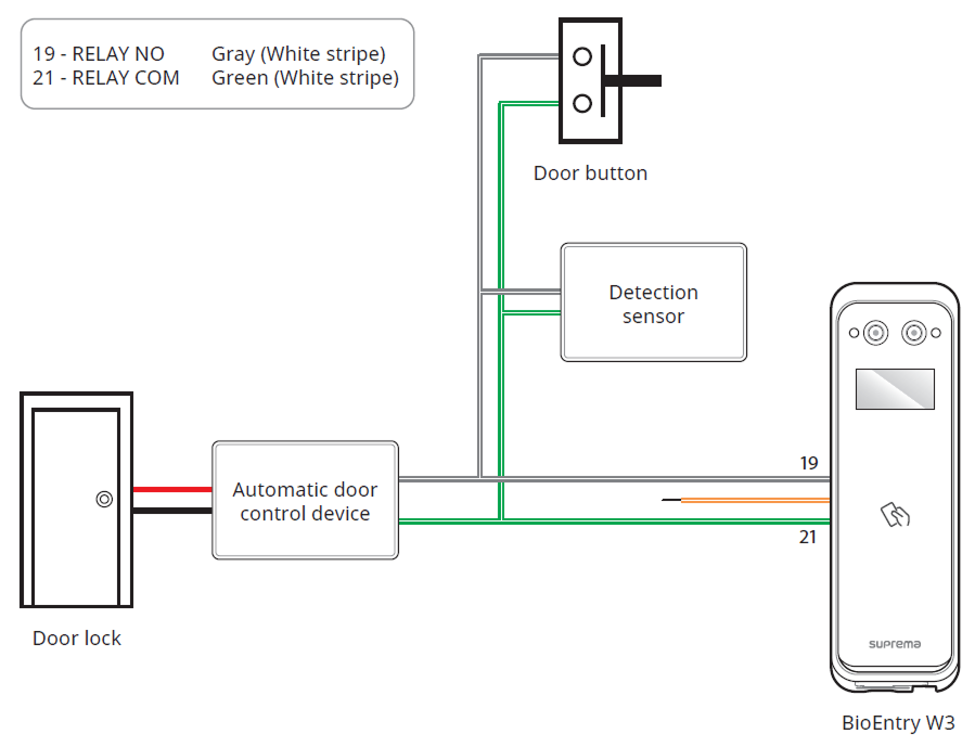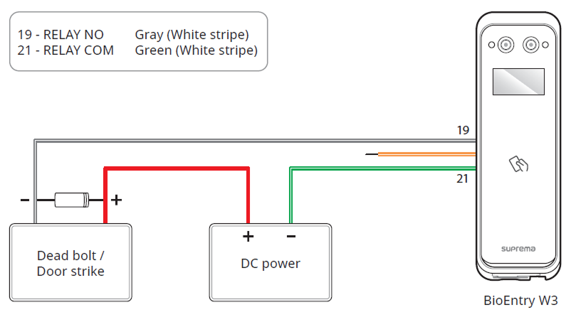 In order to use the Fail Secure Lock, connect N/O relay as shown in the figure below. There is normally no current flowing through the relay for the Fail Secure Lock. When the current flow is activated by the relay, the door will open. If the power supply to the product is cut off due to a power failure or an external factor, the door will lock.