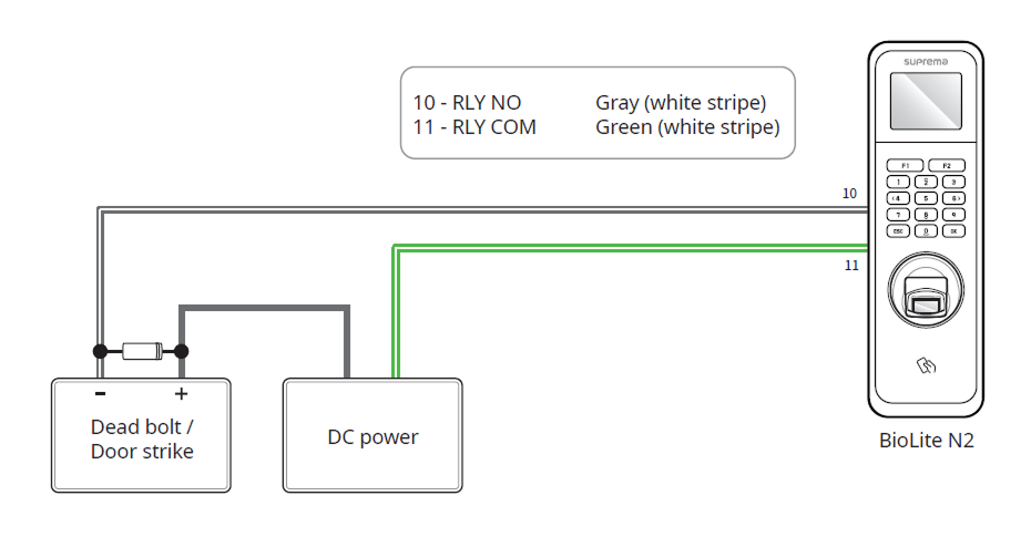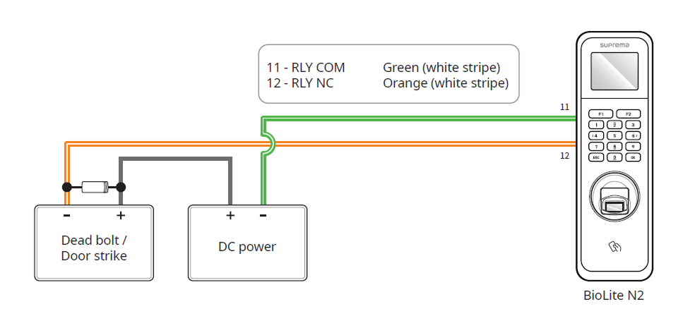 Suprema’s standalone intelligent readers contain internal relays that can directly lock/unlock doors without external controllers for added convenience. For access control applications in need of security, however, it is NOT recommended to use the internal relay of a reader to prevent any tampering attacks which can potentially trigger the door unlock. For such applications, it is highly recommended to use a separate relay unit for a lock control such as Suprema’s Secure I/O 2, DM-20 or CoreStation installed at a secure side of a door.