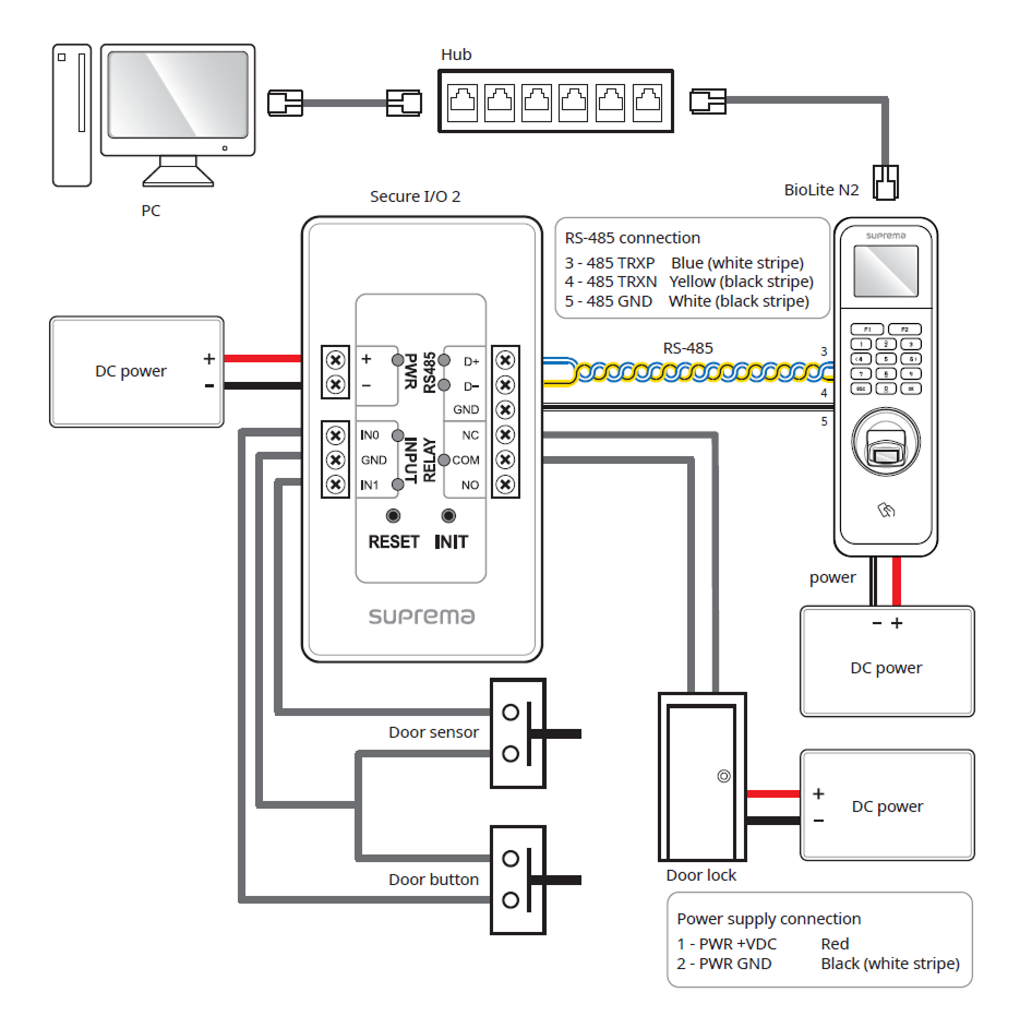 - Use a separate power supply for Secure I/O 2, the electric lock, and the product respectively. If connecting and using the power supply to these devices together, the devices may malfunction.