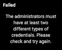 If there are not two types of credentials enrolled for all administrators, activation fails and an error message is displayed. Enroll two types of credentials for all administrators and try again.