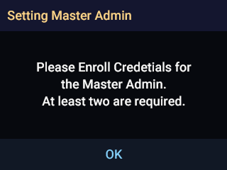After enrolling two or more types of credentials, press OK to complete Master Admin enrollment.