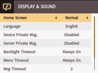 Msg Timeout: Set the time (sec) for a setting complete message or notification message to disappear automatically.