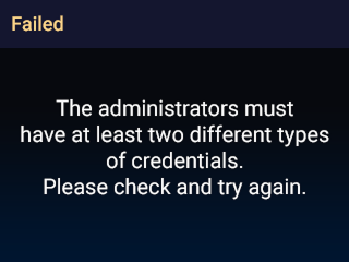 If there are not two types of credentials enrolled for all administrators, activation fails and an error message is displayed. Enroll two types of credentials for all administrators and try again.