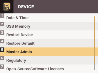 Select DEVICE → Regulatory and then press OK. You can check the regulatory certifications.