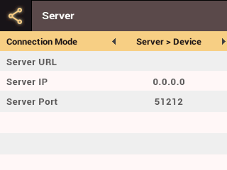 Connection Mode: Selecting Device > Server will send a connection signal directly to a server with the input information from the device. When the Device > Server setting is enabled, the user can enter Server URL, Server IP, Server Port.