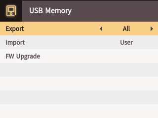 Import: Import user information from the connected USB memory. Select the item and then press OK.