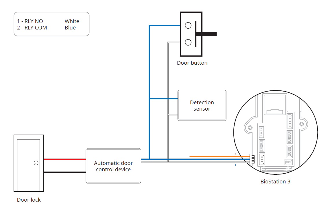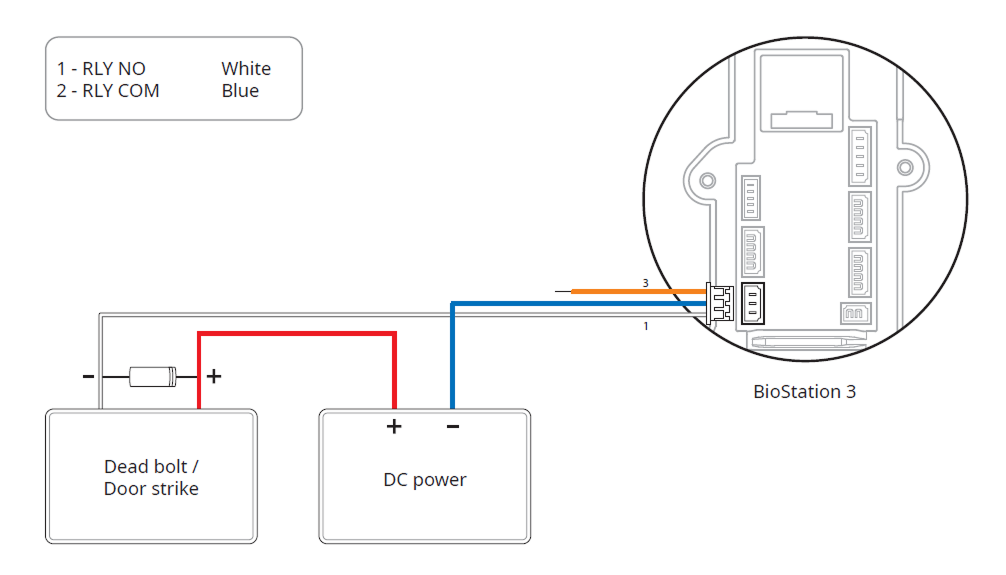 In order to use the Fail Secure Lock, connect N/O relay as shown in the figure below. There is normally no current flowing through the relay for the Fail Secure Lock. When the current flow is activated by the relay, the door will open. If the power supply to the product is cut off due to a power failure or an external factor, the door will lock.