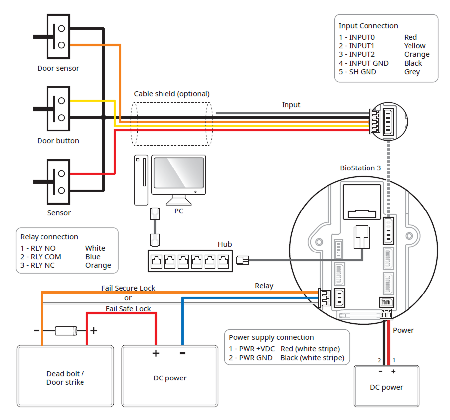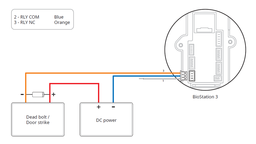 In order to use the Fail Safe Lock, connect N/C relay as shown in the figure below. There is normally a current flowing through the relay for the Fail Safe Lock. When the relay is activated, blocking the current flow, the door will open. If the power supply to the product is cut off due to a power failure or an external factor, the door will open.