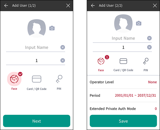 Extended Private Auth Mode: You can set the extended personal authentication mode. This mode allows you to combine user authentication methods, including both faces. Otherwise, you can use the device’s basic authentication mode.