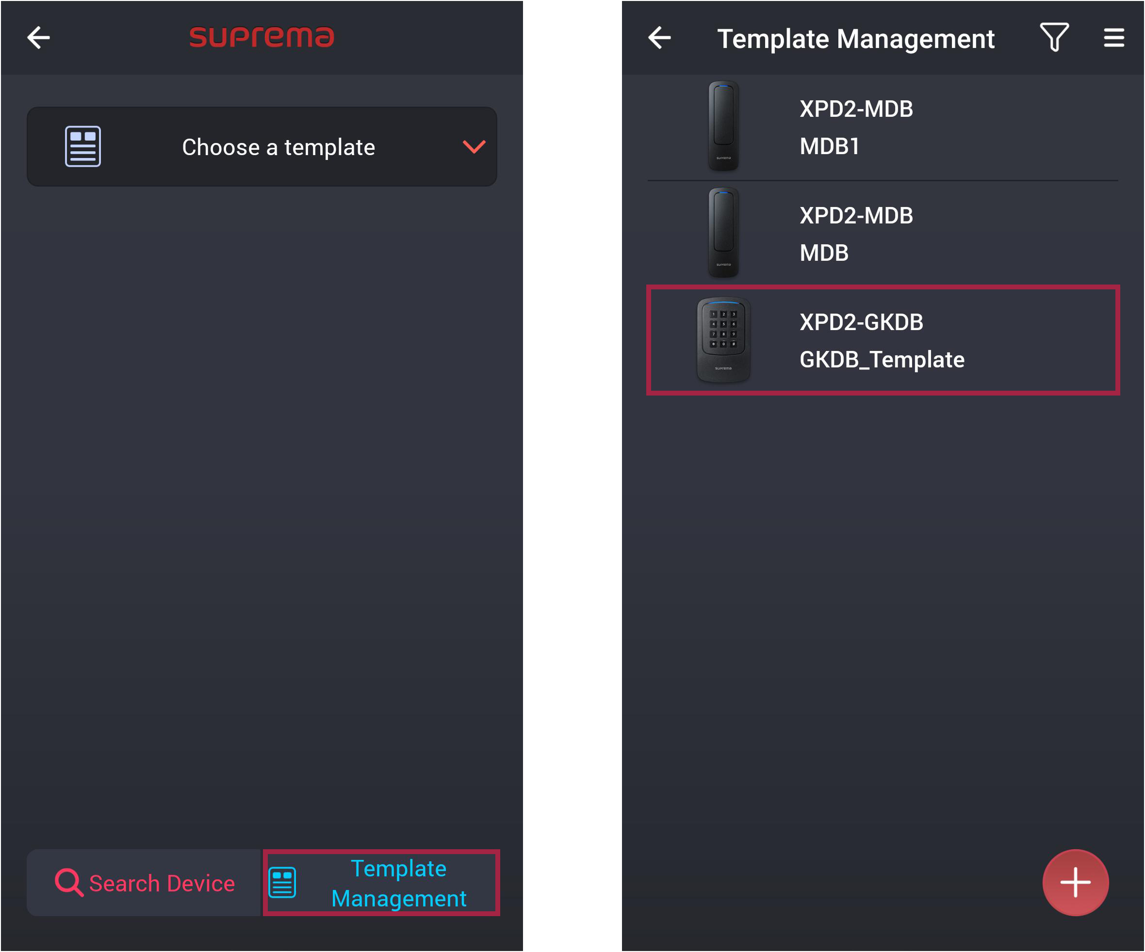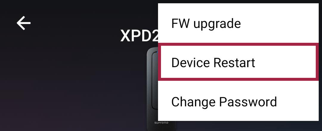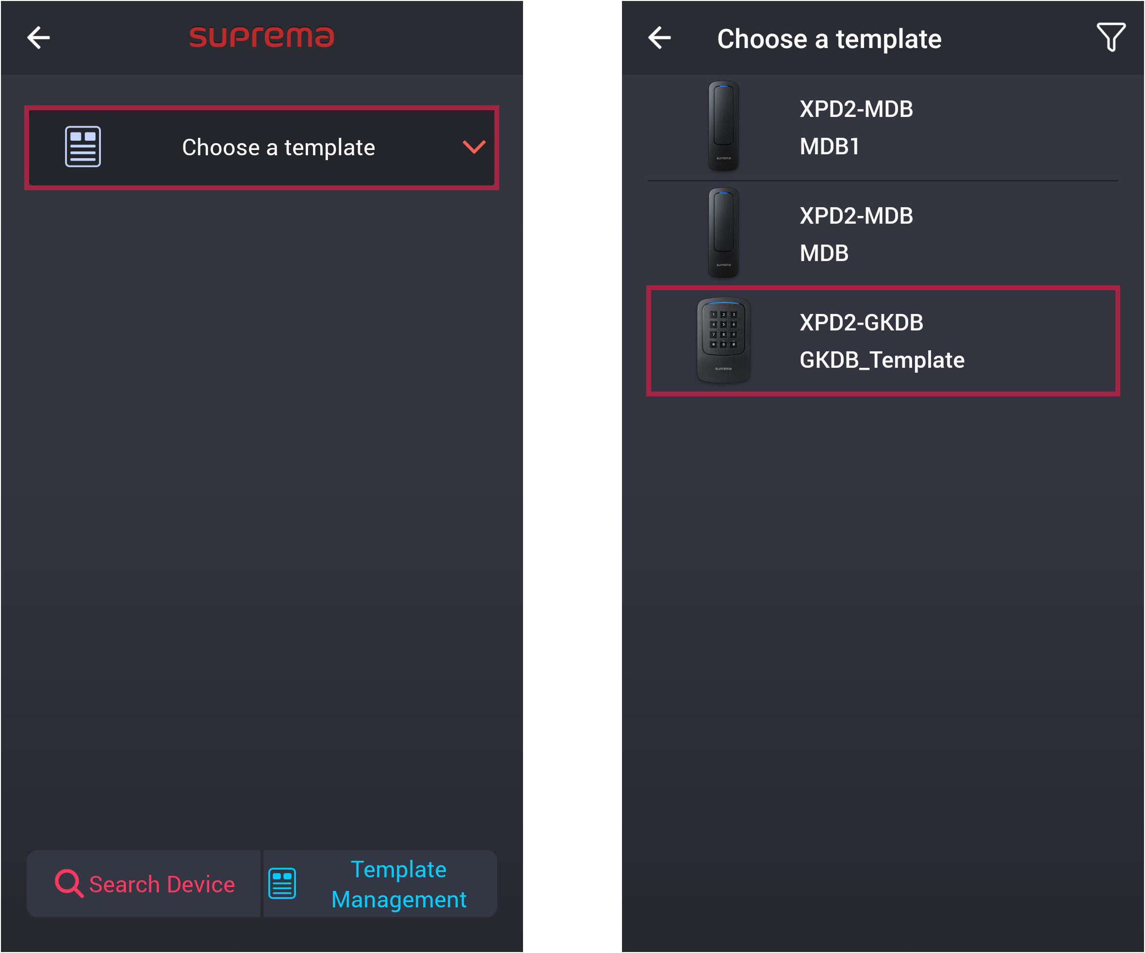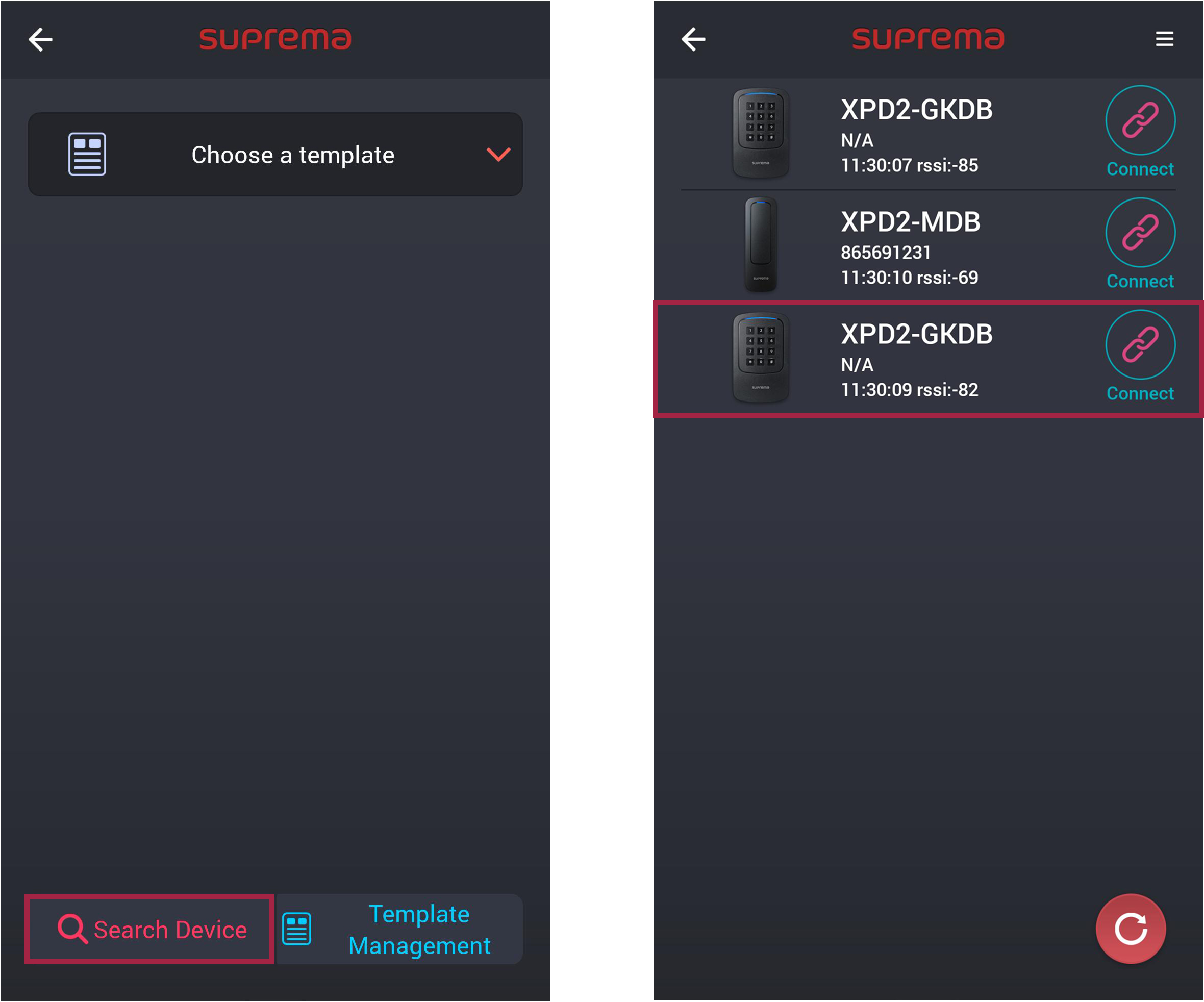 You can search for and connect to XPass D2 installed nearby. By connecting to Suprema Device Manager, you can upgrade the firmware of the device or use features such as restarting the device or changing the template password.
