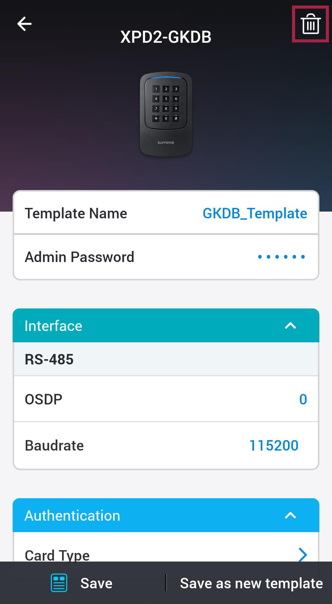 You can set RS-485 communication, card format, keypad settings, PIN, LED, and buzzer before adding them as a template. Adding a template allows you to quickly and easily apply settings without configuring each individual device every time.