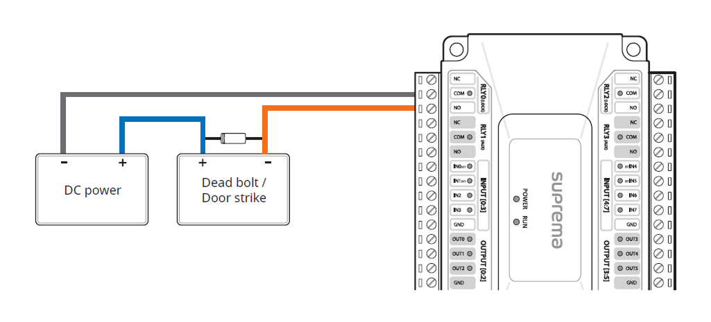 Connect a diode to both ends of the power input as shown in the figure below when installing a deadbolt or a door strike. Make sure to connect the Cathode (direction to the stripe) to the + part of the power while paying attention to the direction of the diode.