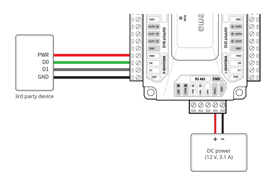 Connect the product to a 12 V, 3.1 A power supply when connecting a Wiegand device.