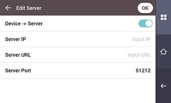 Device → Server: You can send a connection signal from the device to a server with the input information directly. When Device → Server is enabled, the user can input Server IP, Server URL, and Server Port.