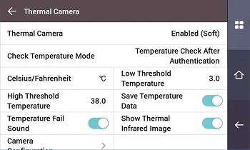 Thermal Camera: You can set whether to use the thermal camera. When set to Enabled (Hard), users exceeding the reference temperature will be denied authentication, and the exceeding temperature event will be logged. When set to Enabled (Soft), users exceeding the reference temperature can authenticate, but the exceeding temperature event will be logged.