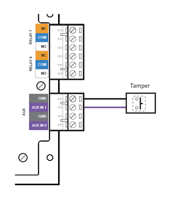 You can connect the contact output (dry contact output) of another device or tamper to the AUX port.