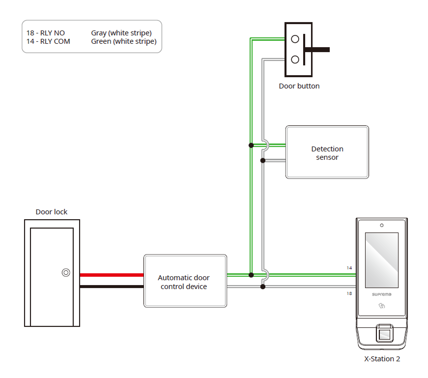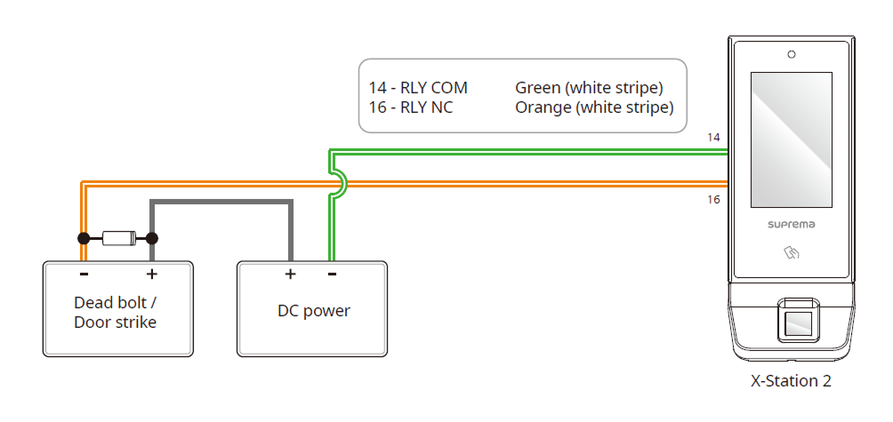 In order to use the Fail Secure Lock, connect N/O relay as shown in the figure below. There is normally no current flowing through the relay for the Fail Secure Lock. When the current flow is activated by the relay, the door will open. If the power supply to the product is cut off due to a power failure or an external factor, the door will lock.