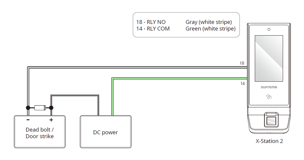 Suprema’s standalone intelligent readers contain internal relays that can directly lock/unlock doors without external controllers for added convenience. For access control applications in need of security, however, it is NOT recommended to use the internal relay of a reader to prevent any tampering attacks which can potentially trigger the door unlock. For such applications, it is highly recommended to use a separate relay unit for a lock control such as Suprema’s Secure I/O 2, DM-20 or CoreStation installed at a secure side of a door.