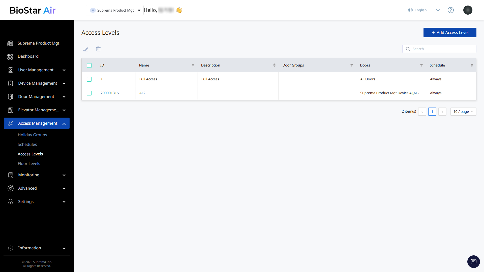 Click Add Access Level at the top right of the screen.
