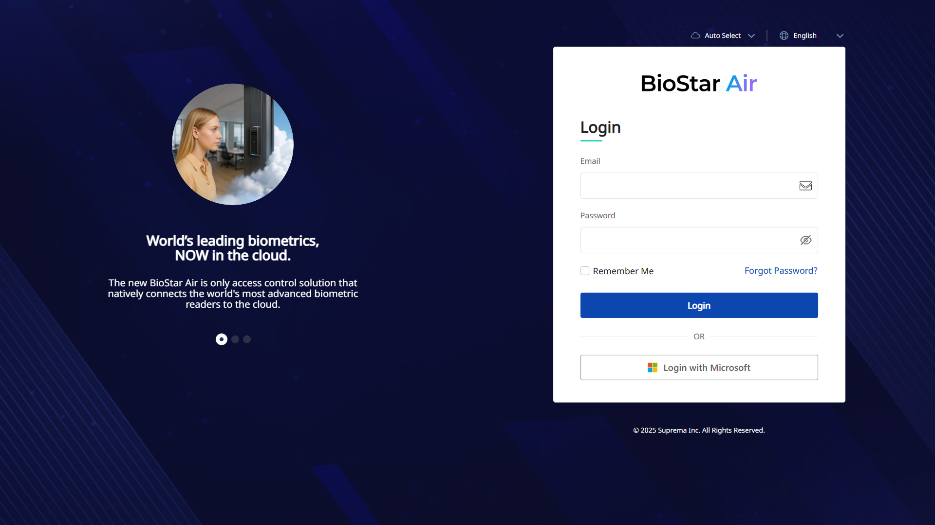 Open a web browser and go to https://admin.biostarair.com to access the BioStar Air portal. When the login page appears, select Global Server or EU Server based on your location.