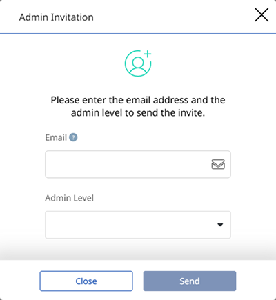 When the Admin Invitation window appears, enter the administrator’s email address and assign a role.
