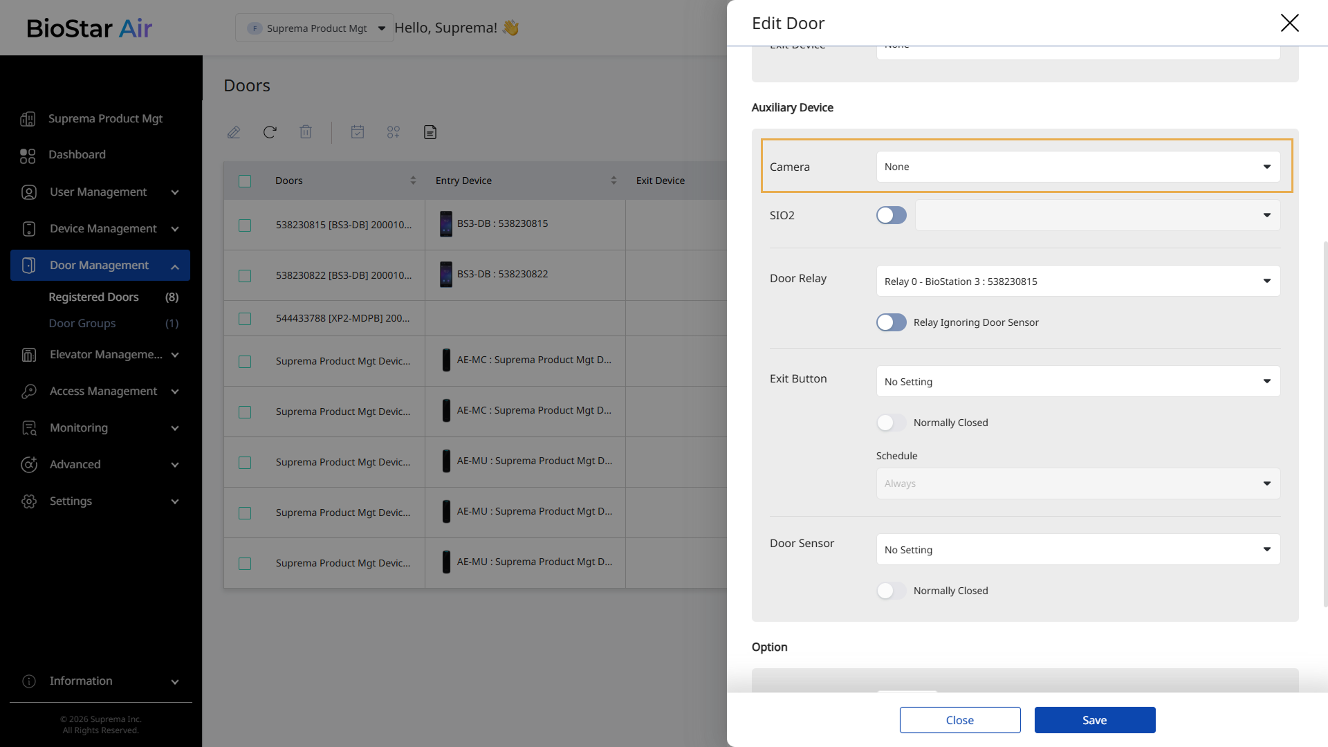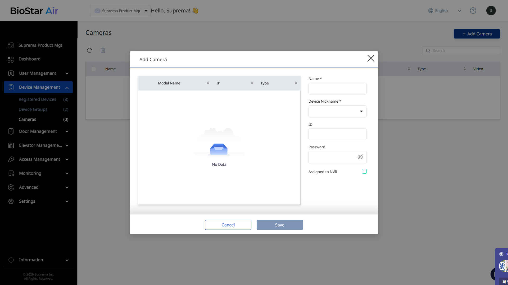BioStar Air automatically detects IP cameras connected to the same network as readers compatible with BioStar Air. Because the cameras use the device as a gateway, a network video recorder (NVR) is not required. Instead, the cameras use the built-in SD card storage.